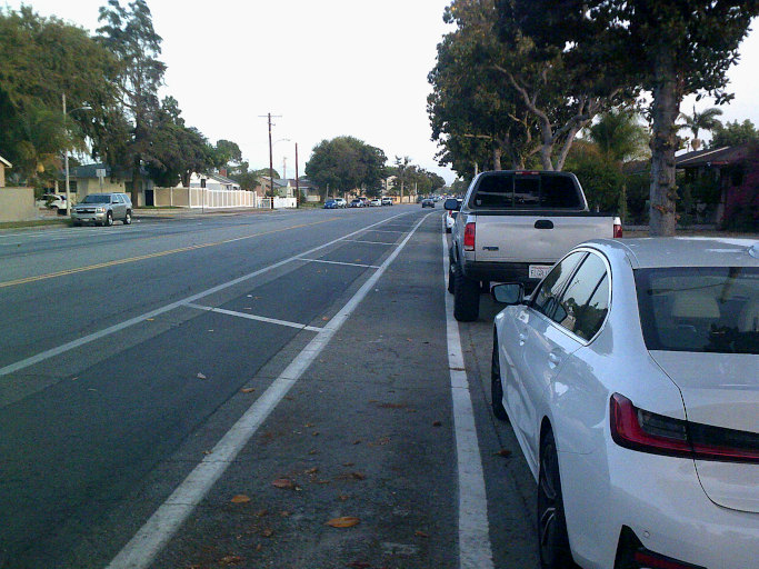 Here's an example. This is right near our house, and these vehicles are parked legally (ie, not too far from the curb), and yet the bike lane was painted to be the door zone, such that if you ride in it, you will eventually hit a door that someone opens just as you're getting there: