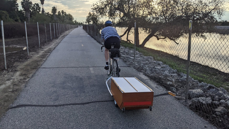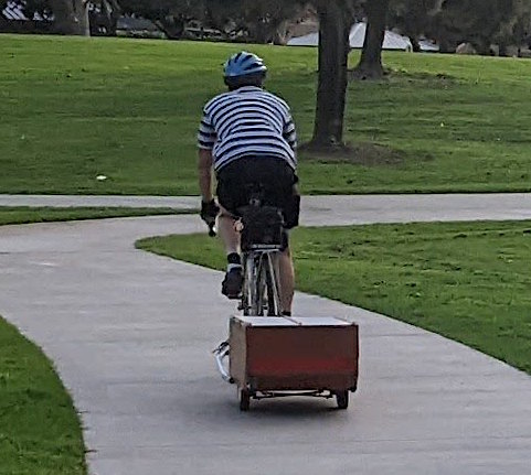 That's me, in street clothes, pulling the trailer with my junk bike (and a trunk bag on the rack), as I would look when taking my load of tools to work on the local bike trail: